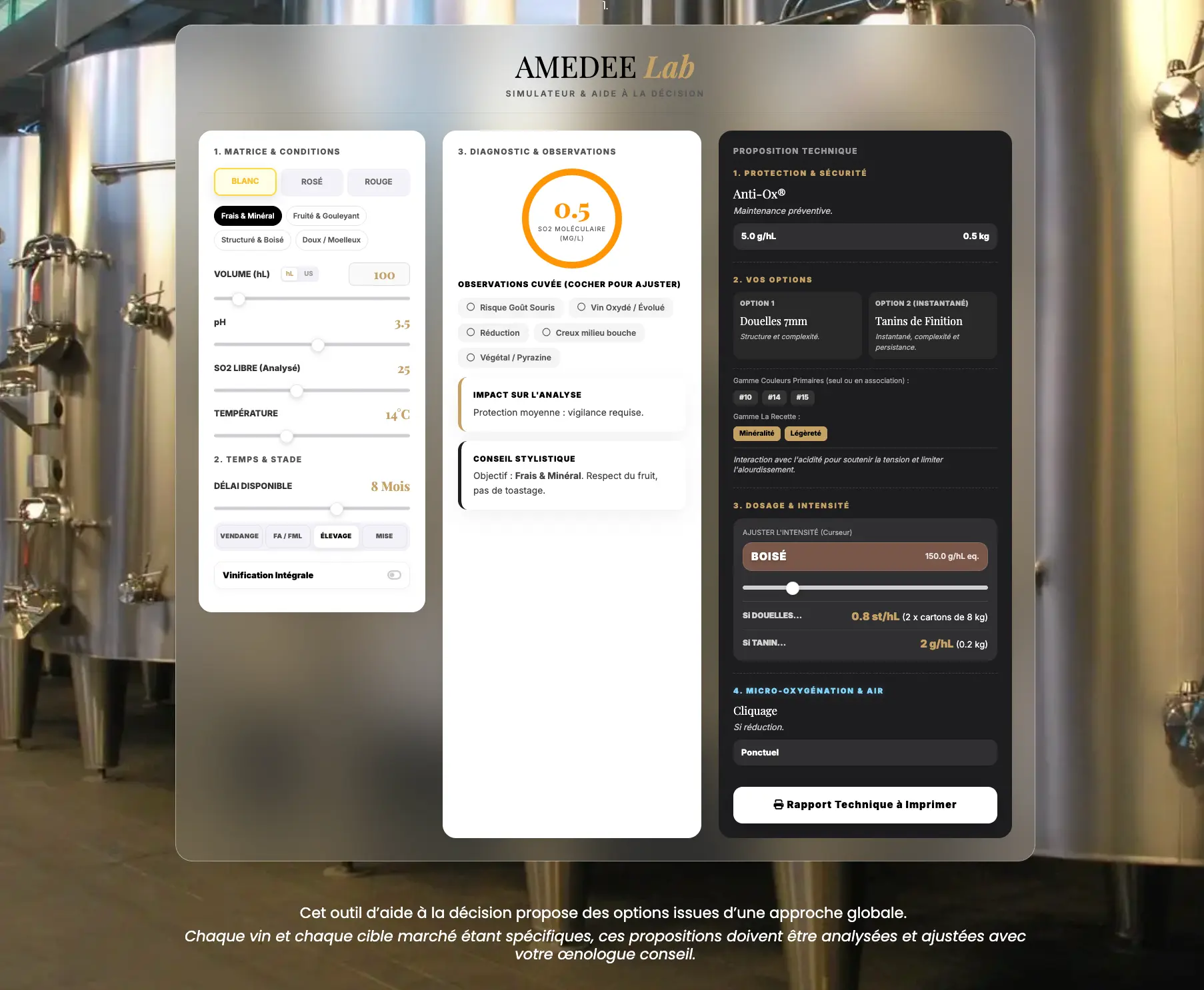 Diagnostic rapide de vos vins (SO2 libre, profils à construire) pour obtenir des recommandations immédiates sur la protection, les apports en bois ou en tanins et la micro-oxygénation.
